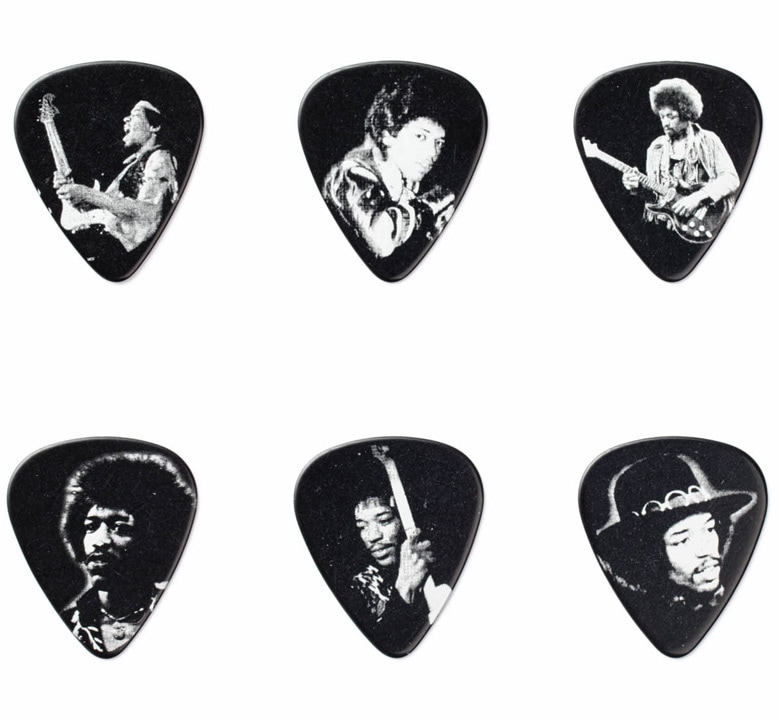 This Pick Tin features 12 heavy gauge celluloid picks with imagery depciting Jimi's dynamic and introspective moments, printed in rich silver ink against a black background in high resolution.